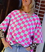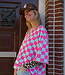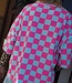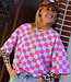 Groen-roze geblokte top met korte mouwen en ronde hals. Een echte eyecatcher die elke outfit hip & trendy maakt!