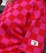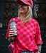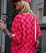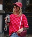Rood-roze geblokte top met korte mouwen en ronde hals. Een echte eyecatcher die elke outfit hip & trendy maakt!