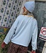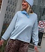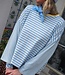 Streepjes, maar dan met een twist! Gestreepte dames top met ronde hals, oversized onesize fit, blauw-witte strepen, gele boord en wijde uitlopende mouwen voor een trendy look.