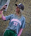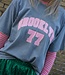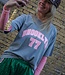 Roze t-shirt met "BROOKLYN 77"tekst op de voorkant. Gemaakt van een comfortabele katoenmix met stretch. Onesizes tot maat 42 – een trendy statement piece met een stijlvolle vibe.