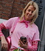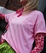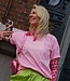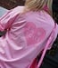 Roze t-shirt met "La Dolce Vita"tekst op de voor- én achterkant. Gemaakt van een comfortabele katoenmix met stretch. Onesizes tot maat 42 – een trendy statement piece met een stijlvolle vibe.