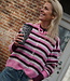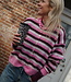 IN LOVE MET DEZE KLEUREN!Een heerlijk warm gestreept vest in de kleuren burgundy, roze en wit. Het vest heeft lange mouwen, een knoopsluiting en een ronde hals.